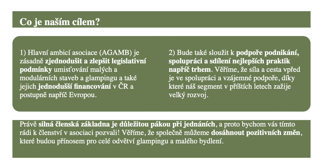 Hlavní ambicí asociace (AGAMB) je totiž zásadně zjednodušit a zlepšit legislativní podmínky umisťování malých a modulárních staveb a glampingu a také jejich jednodušší financování.